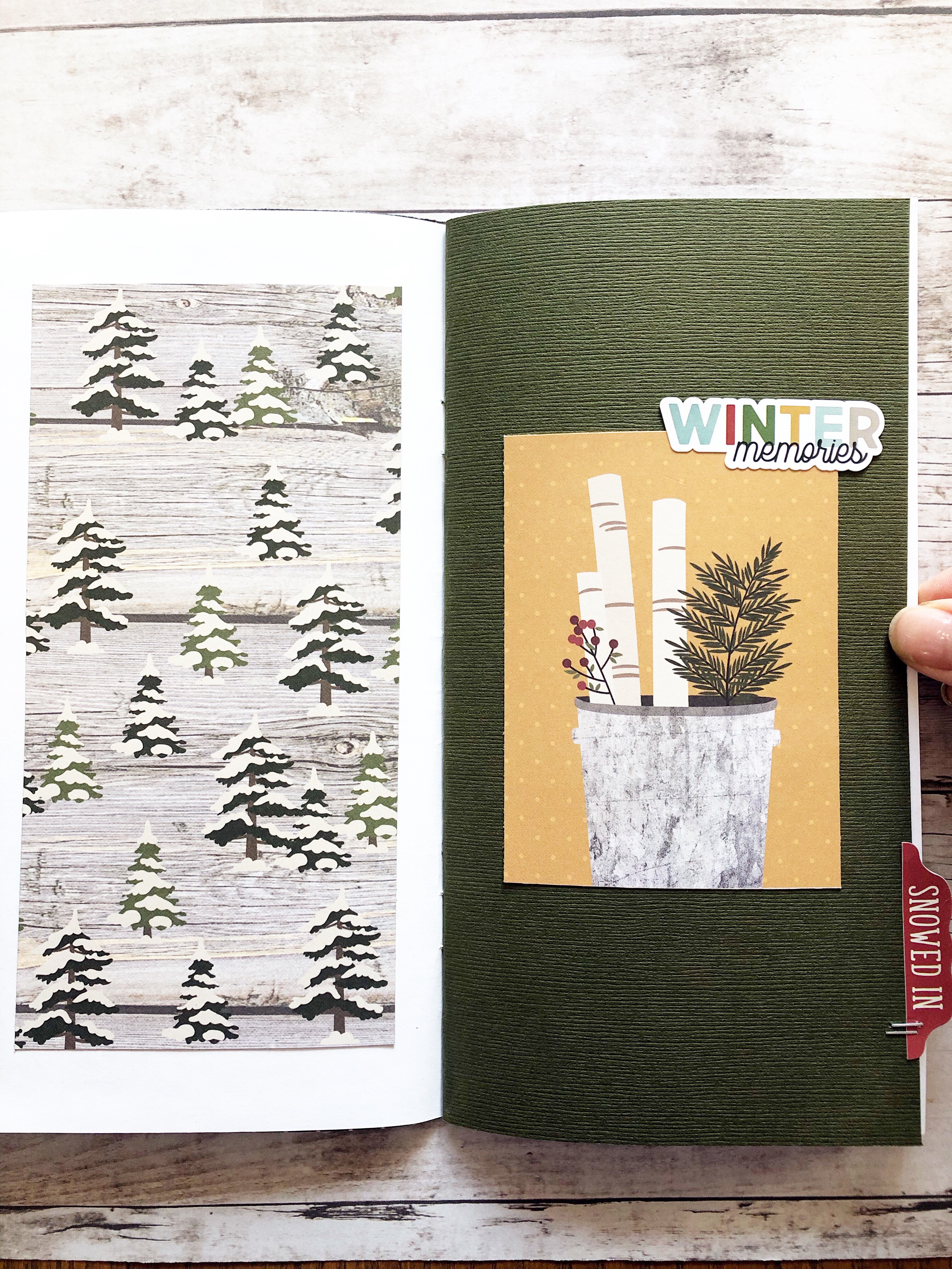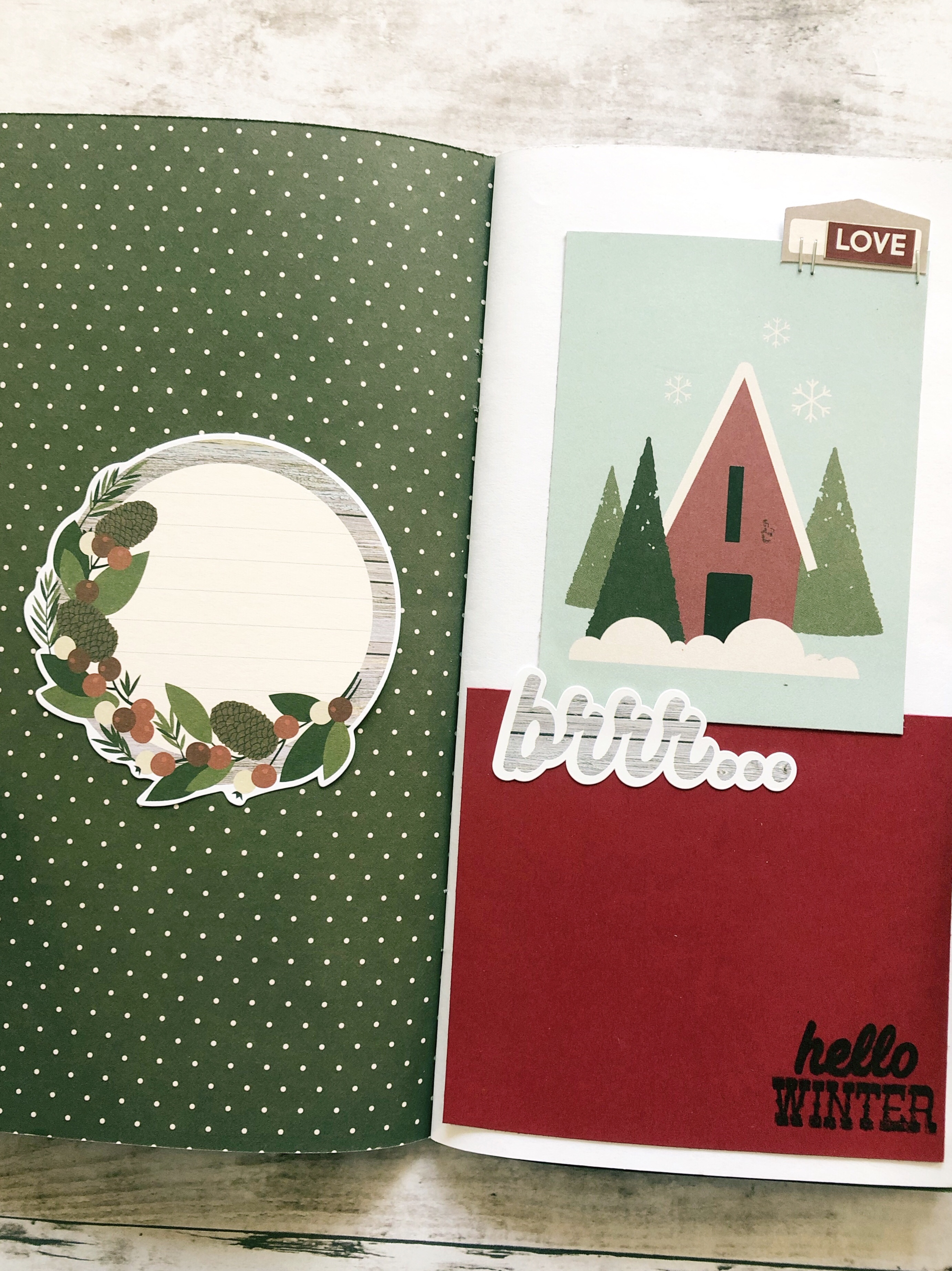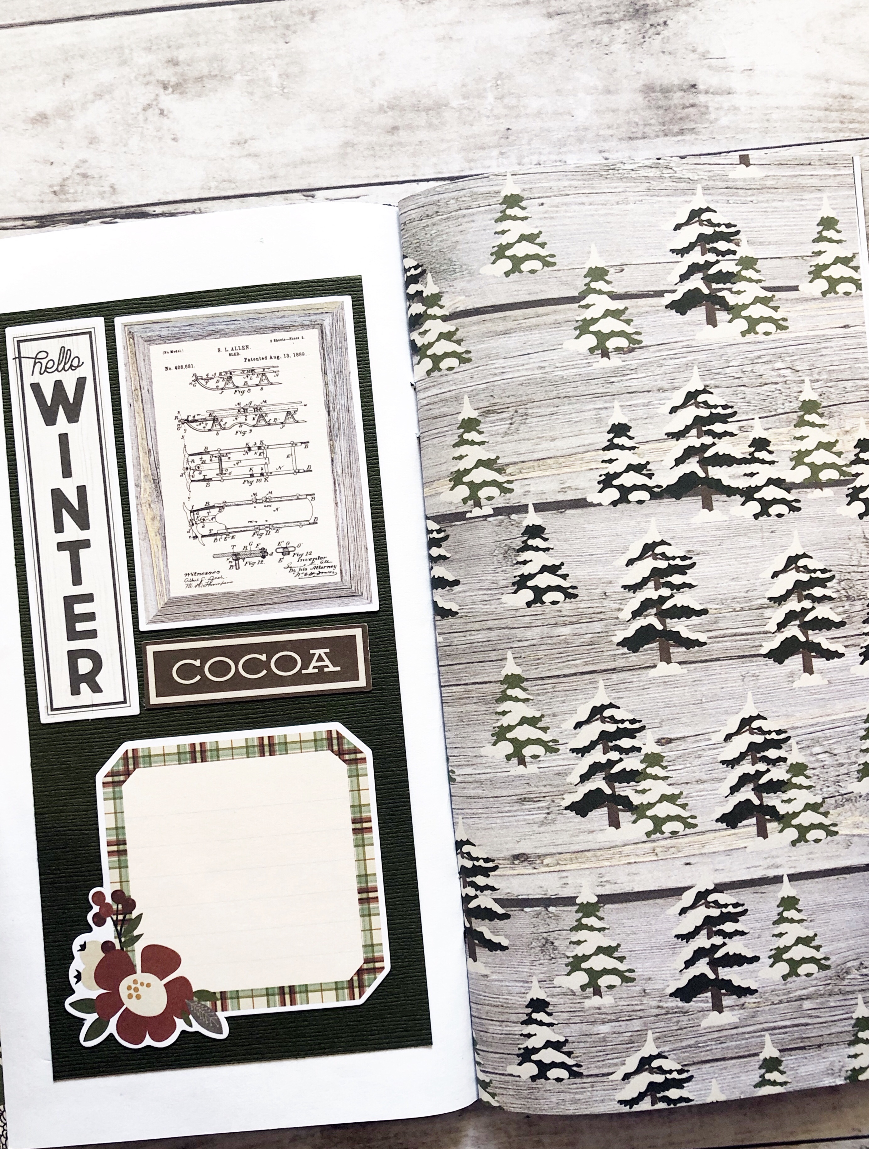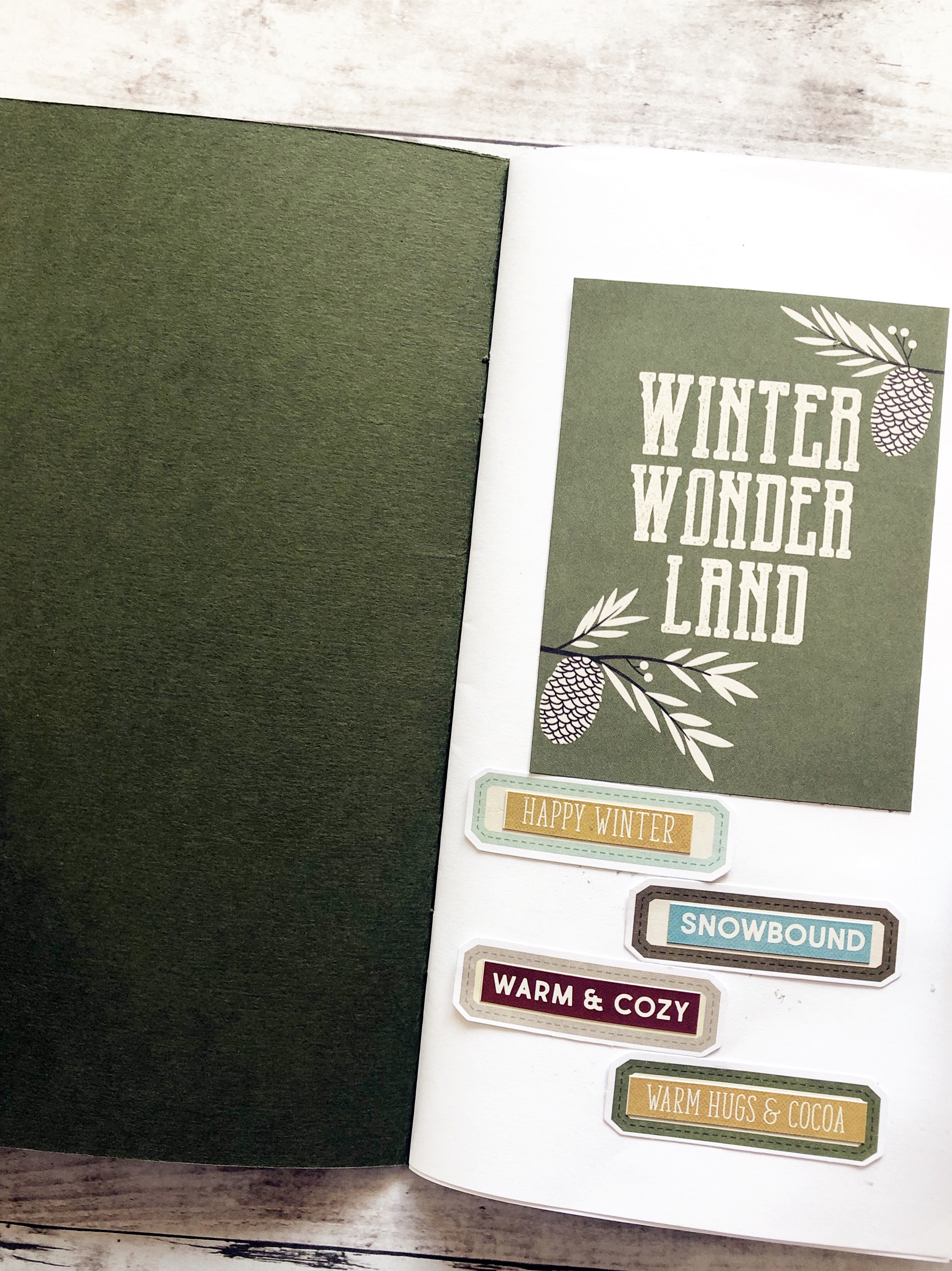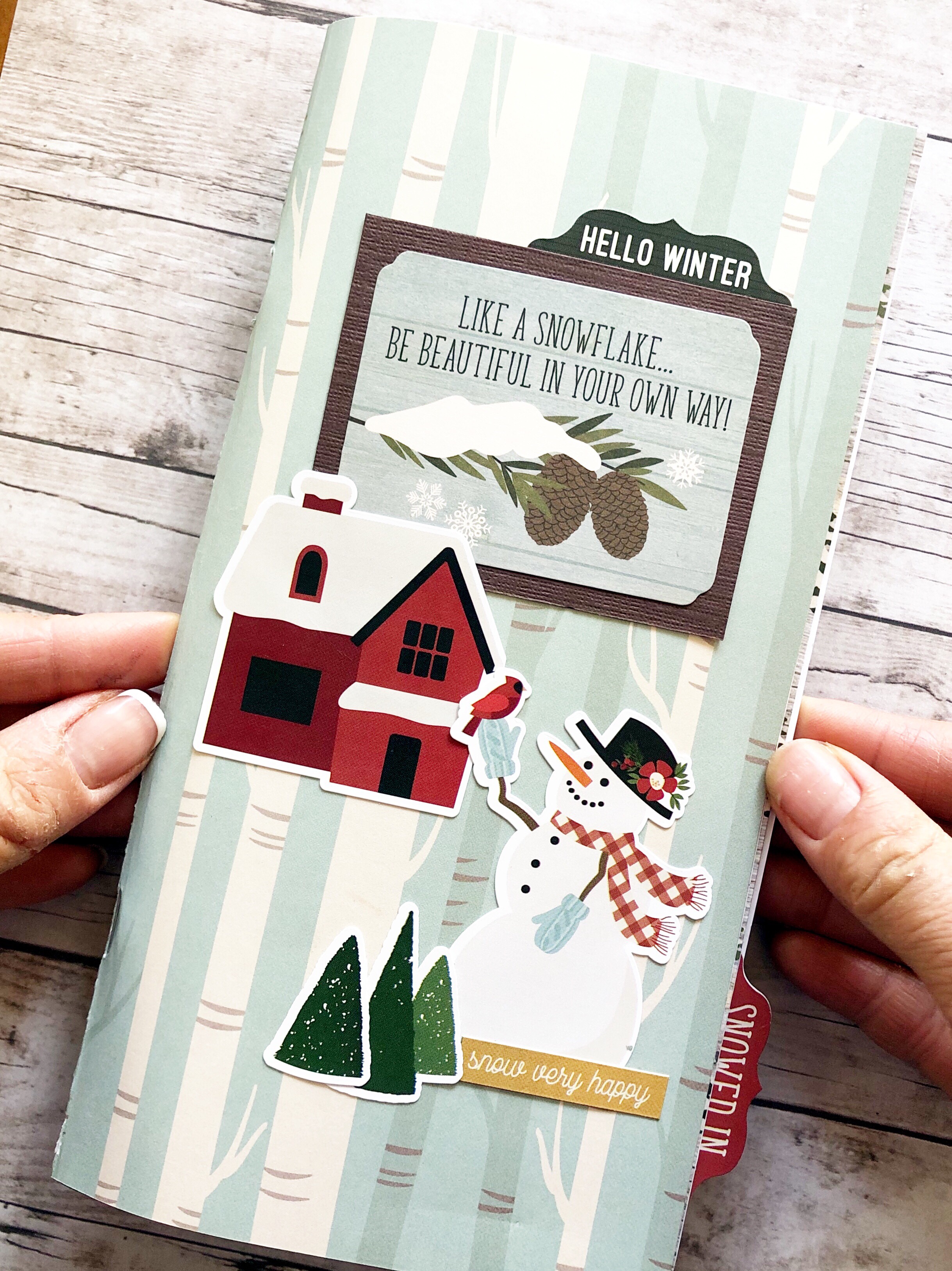 In this design team project, I used the Simple Stories Winter Farmhouse Paper Collection and made my own Standard sized Traveler’s Notebook. I replaced the cover and added a few pages of the paper in between the blank white pages. I stapled them altogether with a long arm stapler.