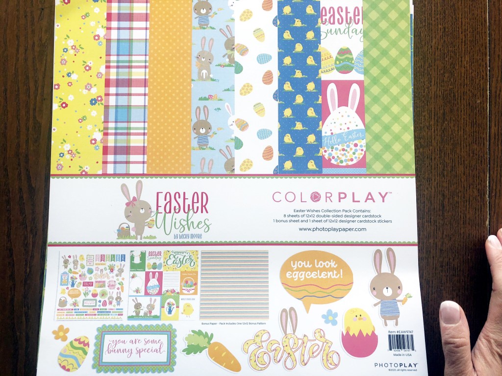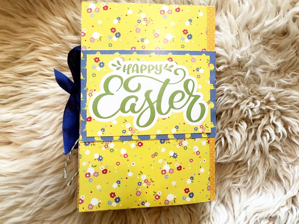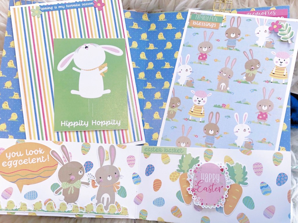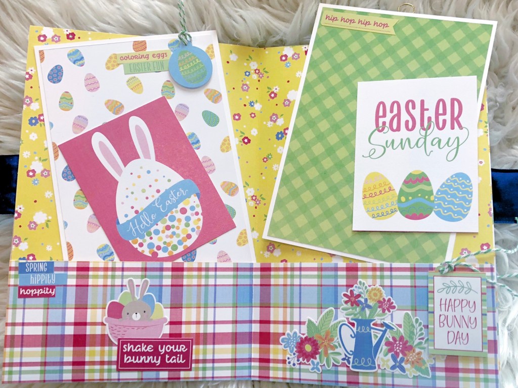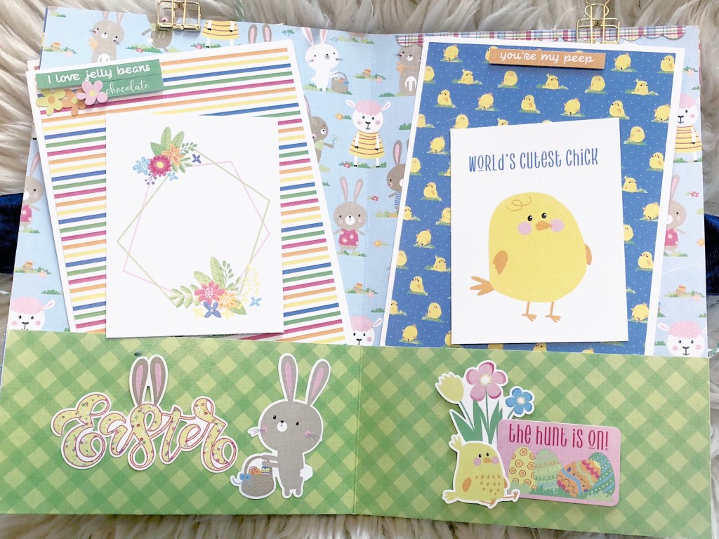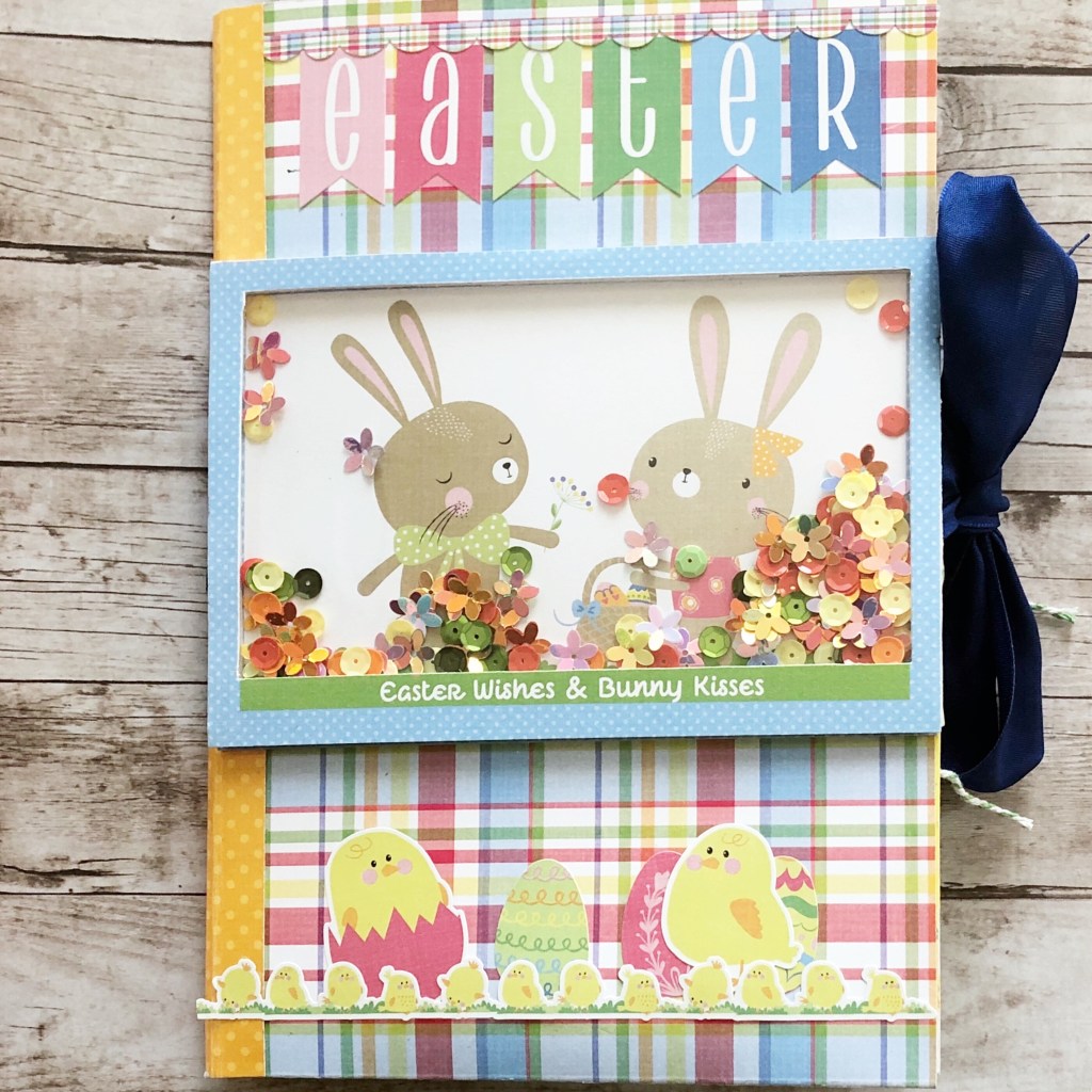 I used Photoplay’s Easter Wishes Collection Pack, which includes 8 sheets of double sided 12×12 designer card stock, 1 bonus sheet, and 1 12×12 designer card stock stickers. I added a shaker element on the cover and some ribbon to close the album and finish it off.