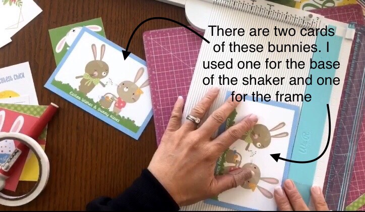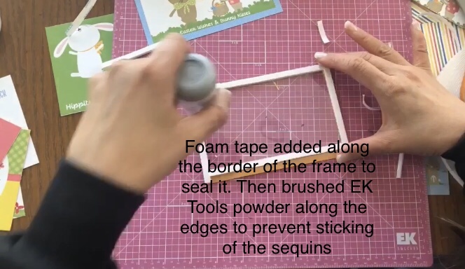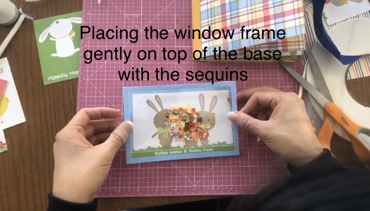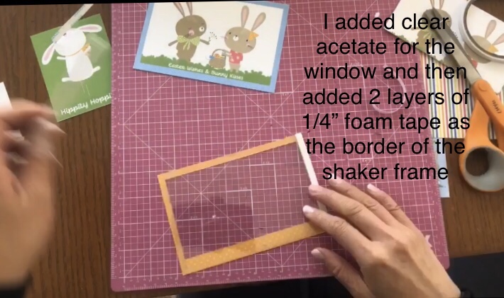 1 Easter Wishes Collection Pack, 1 4×6 clear acetate sheet, 1/4” foam tape, folded to make two layers, Sequins, Ribbon