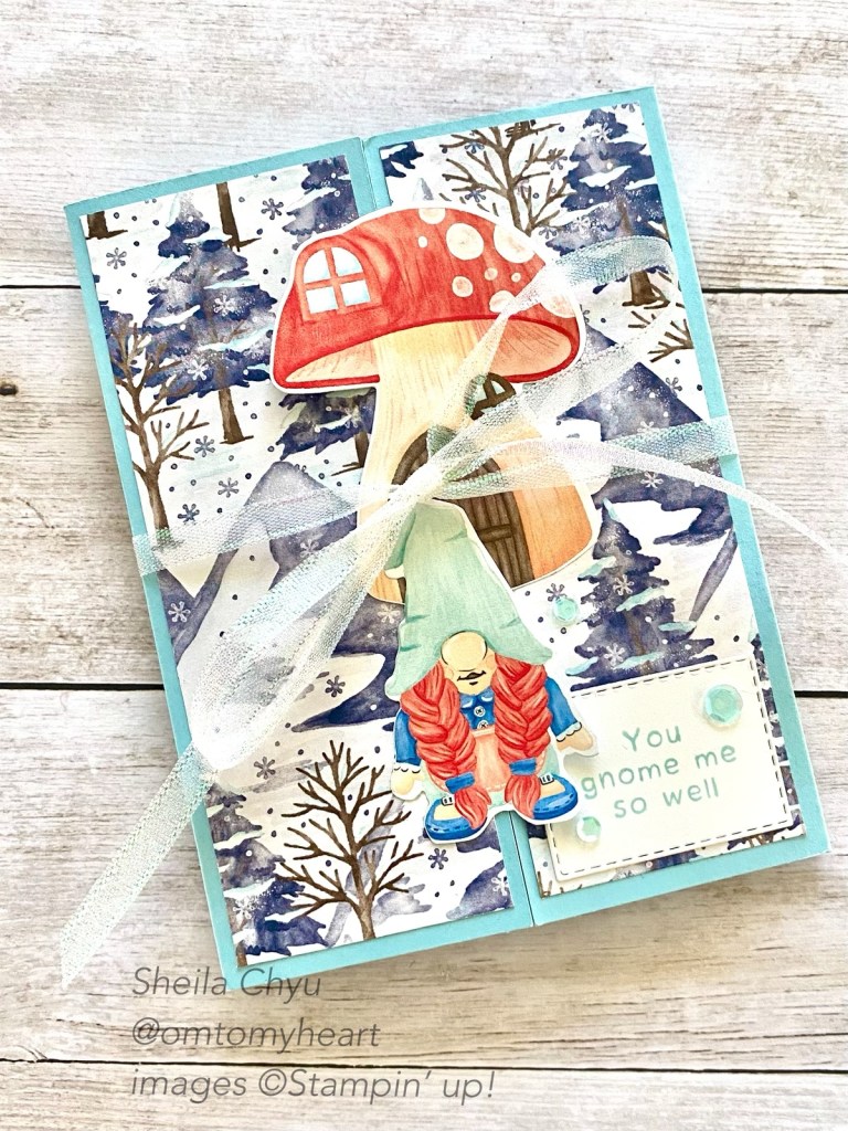 Here is my version of the Pop Out Bendy Fun Fold Card. I used the Storybook Gnomes DSP and Gnomes Dies for this card, as well as the Kindest Gnomes Cling Stamp Set. You can get all of this in the suite bundle, Storybook Gnomes Suite Collection.